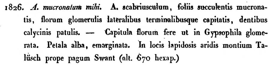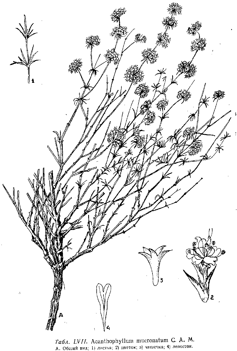 Протолог Acanthophyllum mucronatum C. A. Mey. (Verzeichniss der Pflanzen, welche wahrend der in den Jahren 1829 und 1830 unternommenen Reise im Caucasus und in den Provinzen am westlichen Ufer des Caspischen Meeres gefunden und eingesammelt worden sind: 210. 1831. [Nov-Dec 1831]):