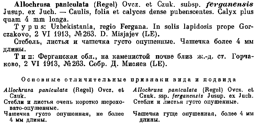 | Andriy Kovalchuk | Обнародование комбинации Allochrusa paniculata ssp. ferganensis Jusupov ex Jukhananov (Ботанический журнал 58(5): 656. 1973):