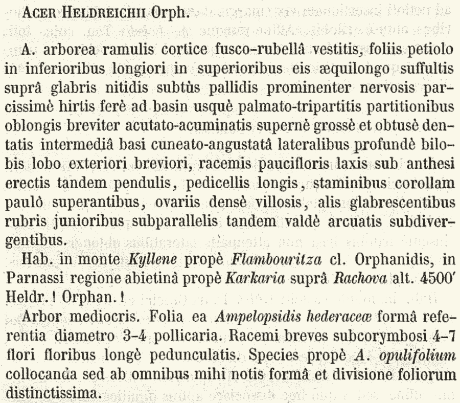 Протолог Acer heldreichii Orph. (Diagnoses Plantarum Orientalium novarum ser. 2, 5: 71. 1856 [Sep-Oct 1856]):