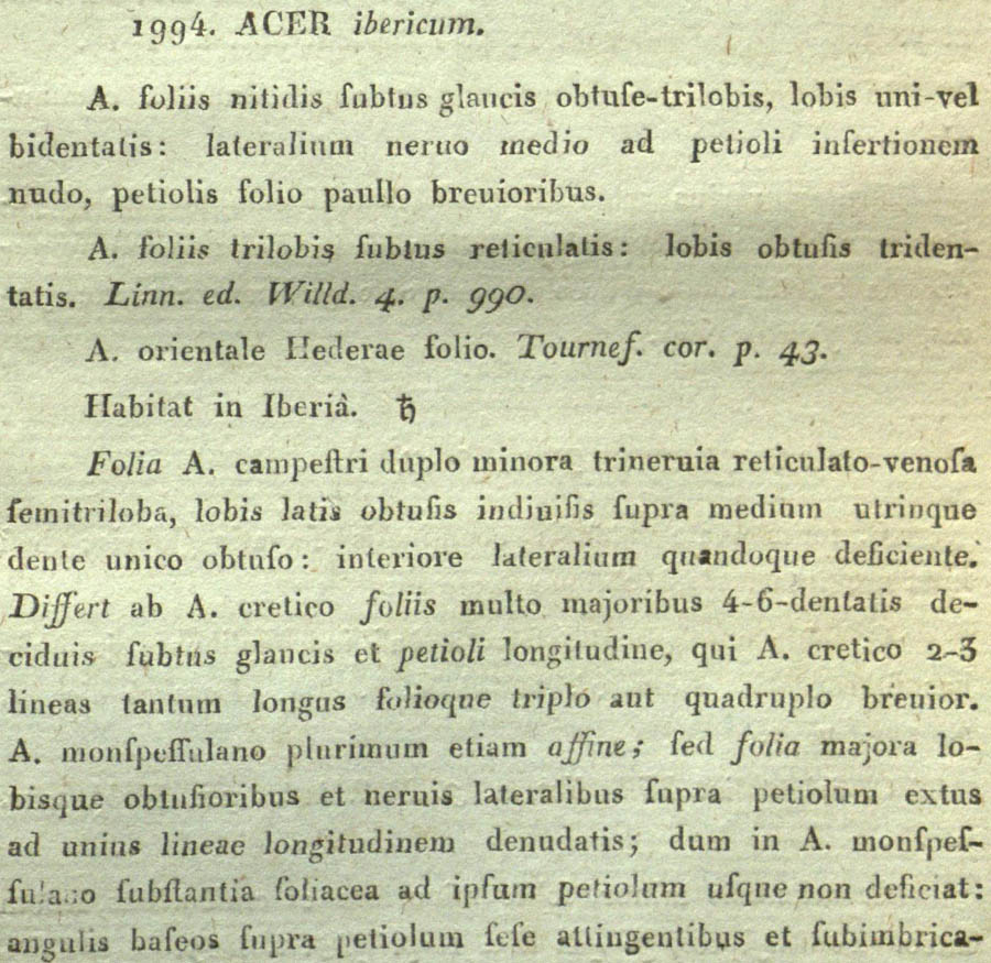 Протолог Acer ibericum M. Bieb. ex Willd. (Species Plantarum. Editio Quarta 4(2): 990. 1806 [Apr 1806]):