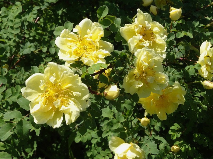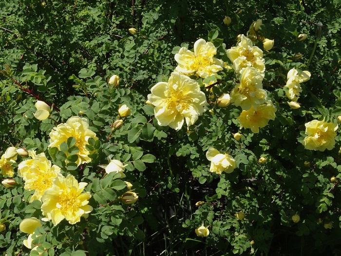 Не похожи цветки. Может быть, это то, что называют 'Lutea Plena' — то ли Rosa spinosissima, то ли R. pimpinellifolia? Первое, вроде бы.