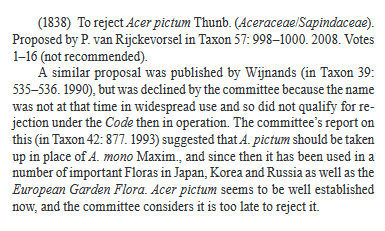 Кстати, в отношении Acer mono (и некоторых других названий) можно/нужно применить и такое авторство: "Maxim. ex Rupr.", поскольку диагноз вида привел именно Рупрехт (см. указание в скобках "(R)" здесь и при прочих названиях), а вот никому не приписанный немецкий текст (Максимовича) в качестве приемлемого описания вида едва ли годится (разве что, с большими допущениями). |