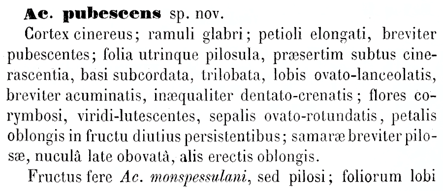 | Alexey Yakovlev | Kew сводит A. pubescens к синонимам, а основным определяет Acer pentapomicum: https://powo.science.kew.org/taxon/urn:lsid:ipni.org:names:781447-1 |