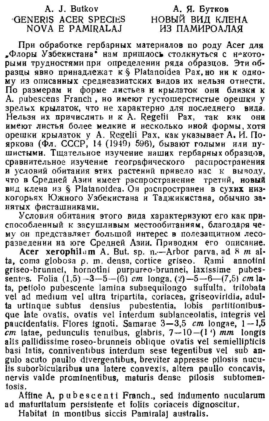 | Andriy Kovalchuk | Протолог Acer xerophilum Butkov (Ботанические материалы гербария Института ботаники Академии наук УзССР 14: 5(-6). 1954):