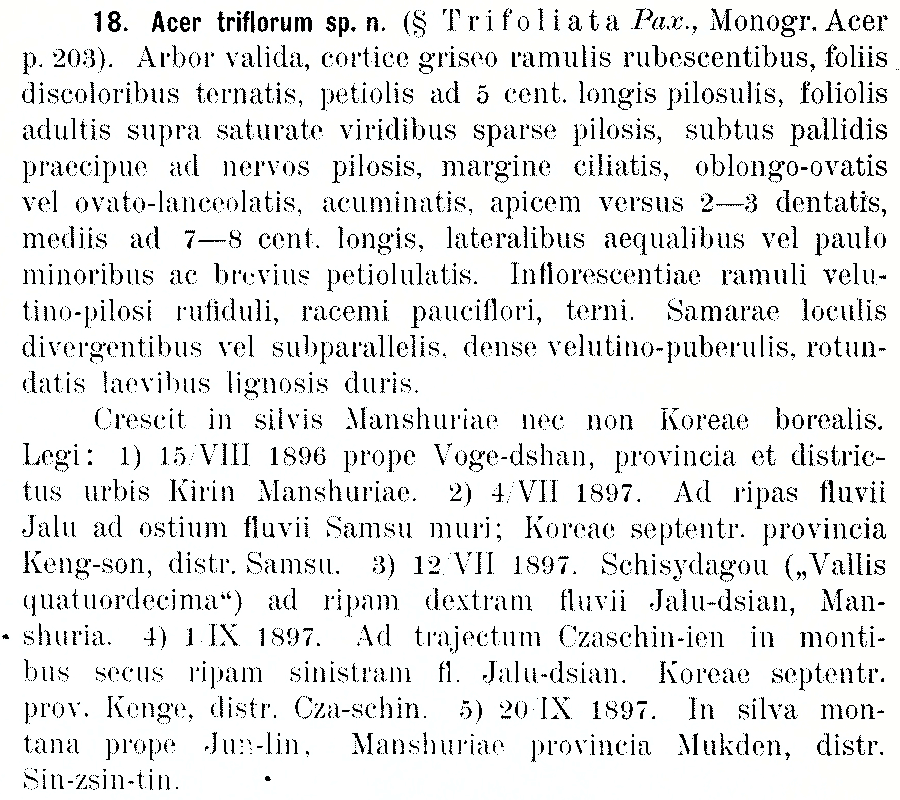 | Andriy Kovalchuk | Комбинация Acer triflorum f. subcoriaceum (Kom.) S.L. Tung является излишней, т.к. этот таксон с самого начала был обнародован в ранге формы (см. протолог). |