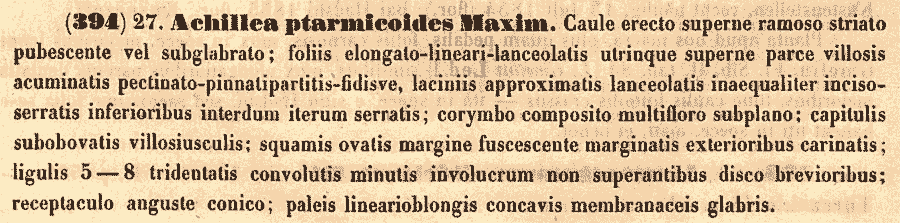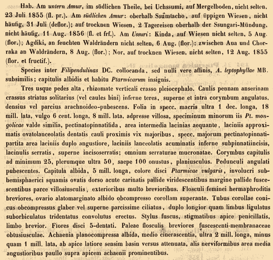 | Andriy Kovalchuk | Протолог Achillea ptarmicoides Maxim. (Primitiae Florae Amurensis 154(-155). 1859) (лектотип: "Untern Amur, in südlichen Theile, bei Uchssumi, auf Mergelboden, nicht selten, 23 Juli 1855 (fl. pr.), C. Maximowicz" (LE); выбран В. П. Бочанцевым во Флоре СССР (т. 26: 122. 1961):