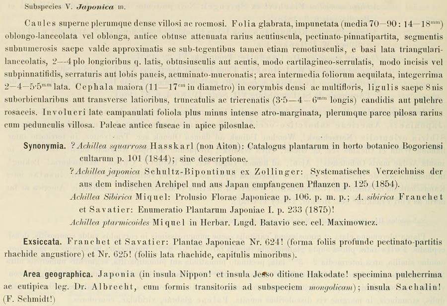 | Andriy Kovalchuk | Ситуация осложняется также наличием ранее опубликованной комбинации Achillea japonica Sch. Bip., которая, однако, по-видимому, является nomen nudum: http://www.biodiversitylibrary.org/item/152475#page/147/mode/1up