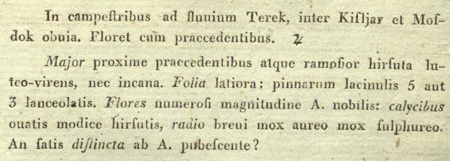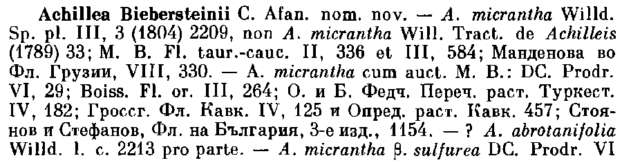 | Andriy Kovalchuk | Отписание Achillea micrantha из работы М. Биберштейна "Flora Taurico-Caucasica exhibens stirpes phaenogamas, in Chersoneso Taurica et regionibus caucasicis sponte crescentes" 2: 336. 1808 (авторство этой комбинации нередко неправильно приписывалось Биберштейну):