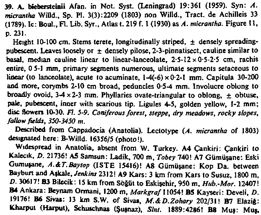 | Andriy Kovalchuk | Обнародование комбинации Achillea biebersteinii Afan. (Ботанические материалы гербария Ботанического института АН СССР 19: 361(-362). 1959) (лектотип: Azerbaijan. ”Talüsch” [Talış Mts.], [Juny 1830,] C.A. Meyer [part of Meyer’s Enumeratio plantarum Caucasicum 633, distributed as A. pubescens in 1832] (G-DC, lectotype; isolectotype LE); выбран А. Н. Сенниковым в Memoranda Soc. Fauna Flora Fennica 87: 42. 2011):