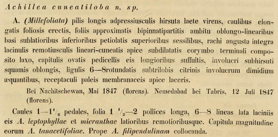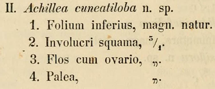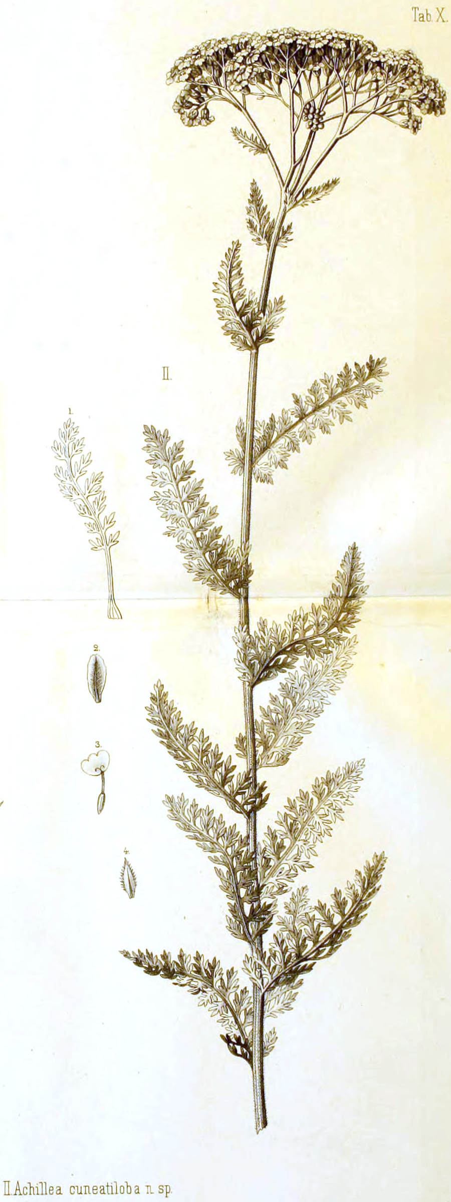 Протолог Achillea cuneatiloba Boiss. & Buhse и сопровождающая его иллюстрация (Nouveaux mémoires de la Société impériale des naturalistes de Moscou 12: 117., t. 10. f. 2. 1860):