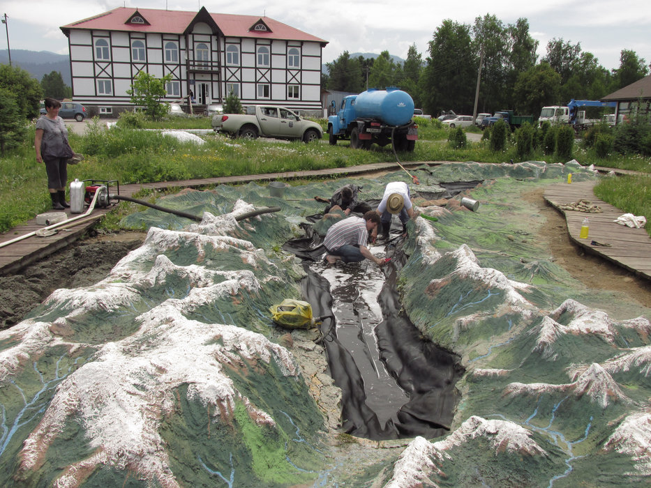 Дважды за лето мы там всё пропалываем и отмываем сам макет (он в масштабе, с горами вокруг и вообще как топокарта