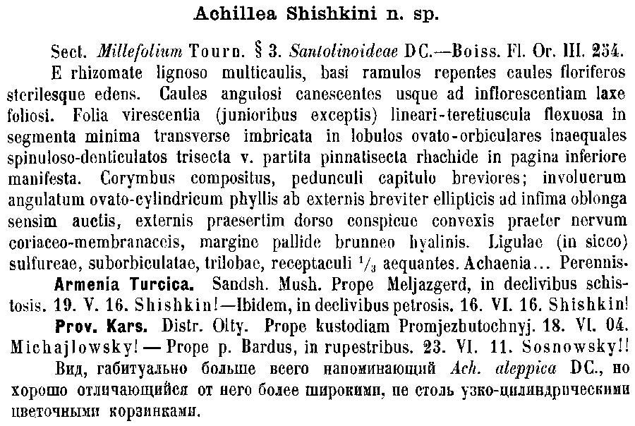 | Dmitry Oreshkin | Тем не менее, в IPNI - с ней: "Achillea s chischkinii Sosn. ex Grossh." |