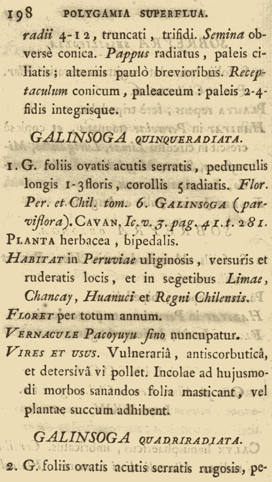 Протолог Galinsoga quadriradiata Ruiz & Pav. (Systema Vegetabilium Florae Peruvianae et Chilensis 1: 198–199. 1798 [late Dec 1798]):