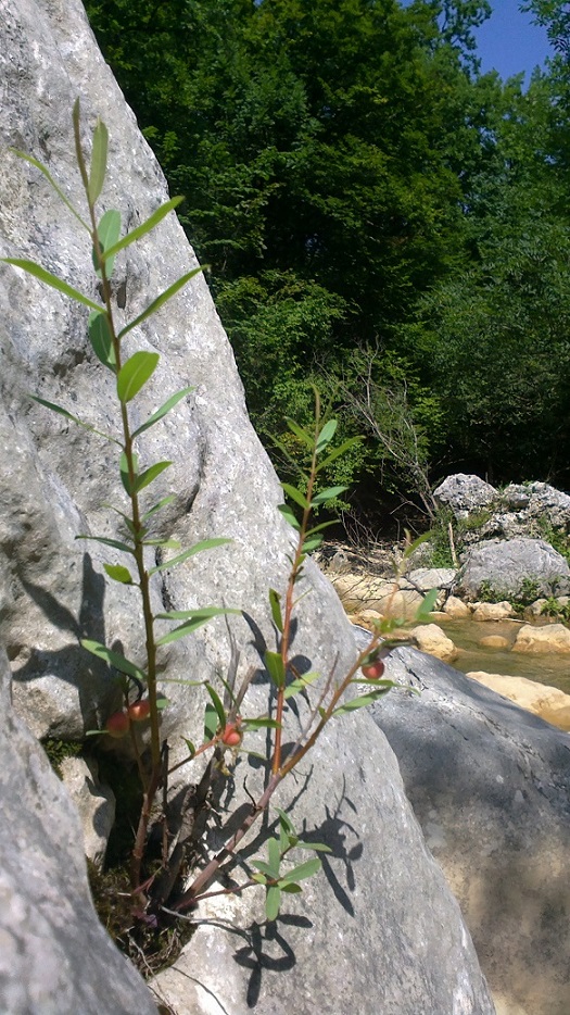 Деревцо (или куст) примостился на камне в Большом Каньоне Крыма на р.Коккозка. Созревают ягоды, август.