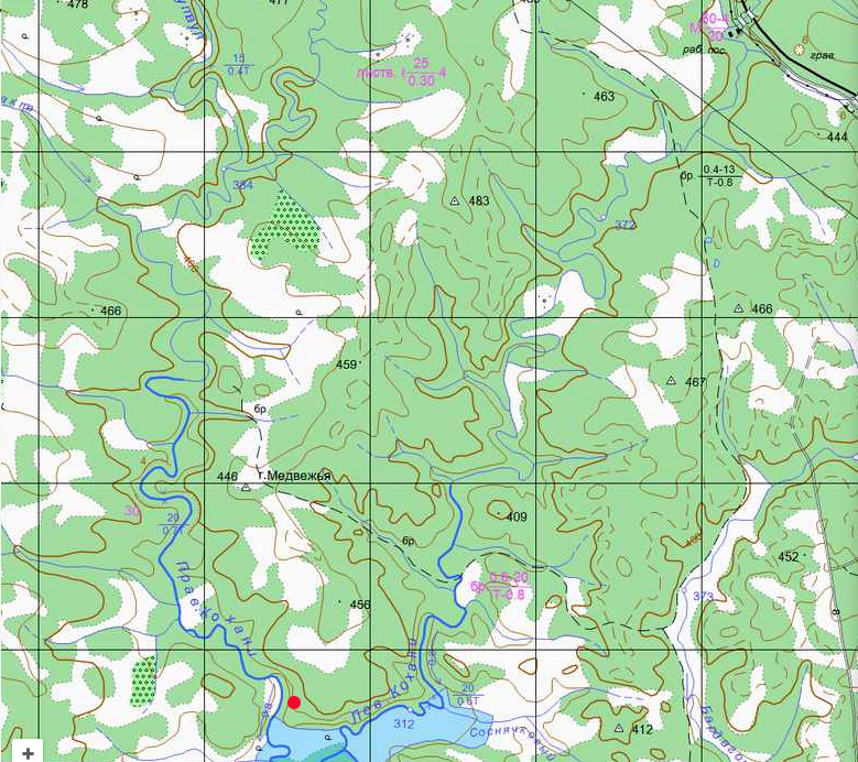 Судя по координатам и подписям к фото, точка охватывает берег залива Кохани, долину реки Правая Кохани, склон горы Медвежья, если, конечно, не ошибаюсь. Есть заболоченные участки (моховые болота, лиственничные мари), есть сухие горные склоны.
