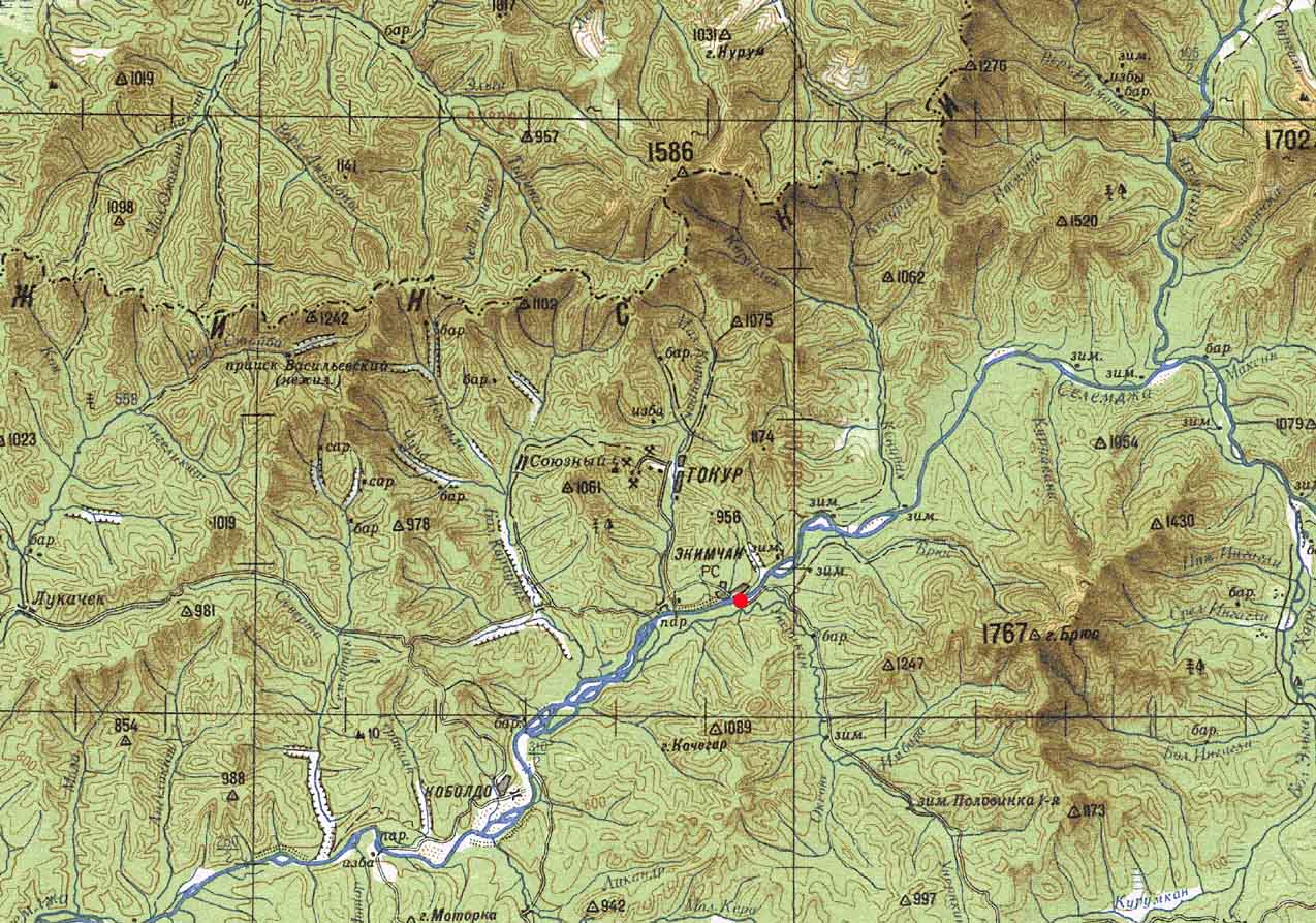 Из описания геоточки: Селемджинский район, окрестности поселков Стойба и Экимчан. Между посёлками Стойба и Экимчан 100 км. Координаты указывают на остров на р. Селемджа возле посёлка Экимчан. С северо-запада на посёлок надвигается Селемджинский хребет, на юго-востоке - гора Брюс.