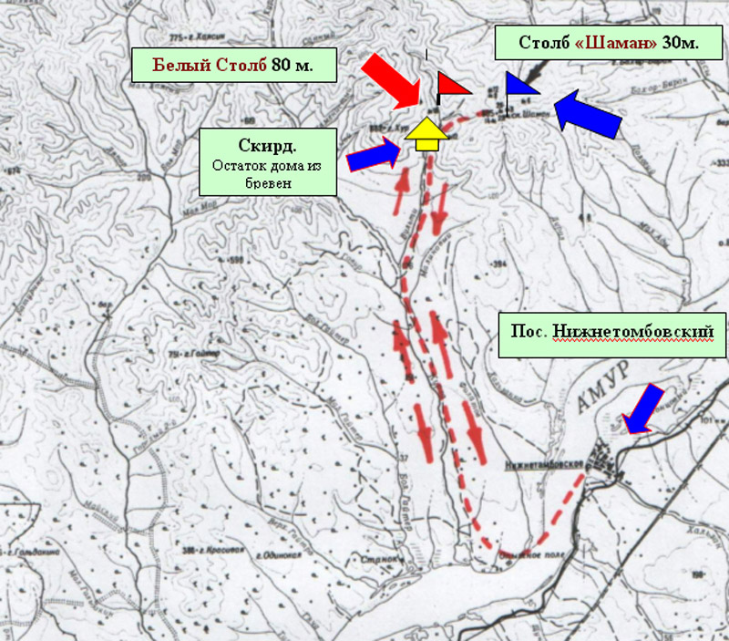 Координаты геоточки указывают на долину реки Курга между устьями реки Говур и ручья Малиновый. Однако Амурские столбы находятся в 8-10 км севернее. Действительно, чтобы попасть на столбы, нужно пройти через эту точку (см. рисунок вверху). Затем подняться вверх по течению реки Курга до места, где собственно и образуется река Курга - это слияние рек Хур и Вульти. И уже по дороге вдоль реки Вульти попасть на Амурские столбы.
