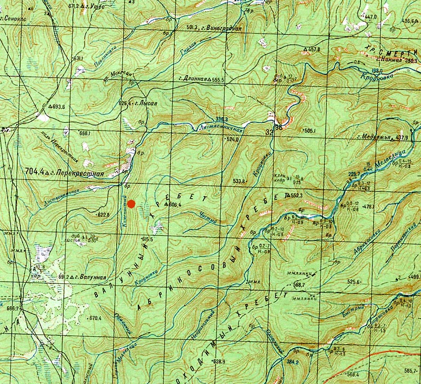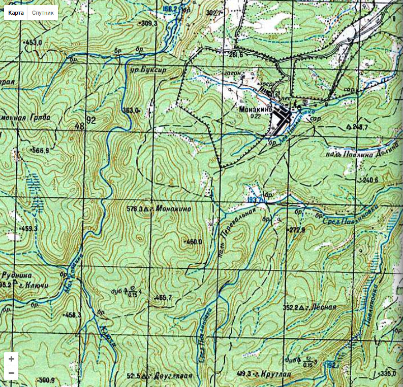Точка в окрестностях села Монакино, недалеко от горы Монакино (576 м) и от точки Кроуновка, в верховьях реки Левая Павлиновка.