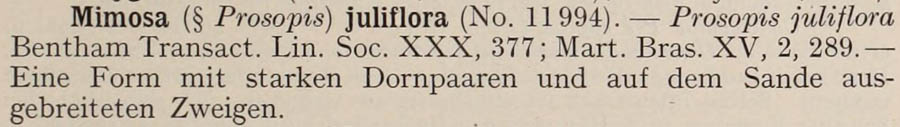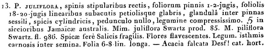 Протолог Mimosa juliflora Sw. (Nova Genera & Species Plantarum seu Prodromus descriptionum Vegetabilium, maximam partem incognitorum quae sub itinere in Indiam Occidentalem annis 1783-87: 85. 1788 [20 Jun-29 Jul 1788]):