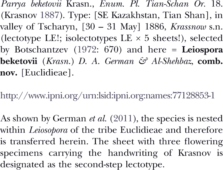 | Andriy Kovalchuk | Обнародование комбинации Leiospora beketovii (Krasn.) D.A. German & Al-Shehbaz (Kew Bulletin 68(3): 469. 2013 [22 Jun 2013]):