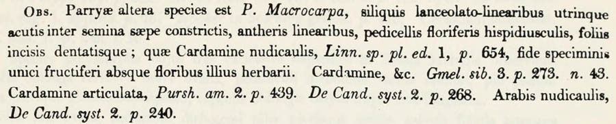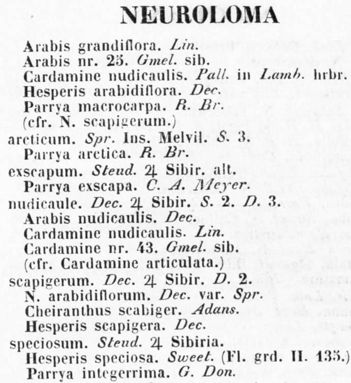 | Andriy Kovalchuk | Вызывает некоторое сомнение принятое в The Plant List отнесение к синонимам Parrya nudicaulis комбинаций Neuroloma speciosum Steud. и Parrya integerrima G. Don. Как видно из протологов, оба названия относятся к растению, описаному как Hesperis speciosa Sweet, но растение, изображённое на рисунке, не очень=то похоже на Parrya nudicaulis. |