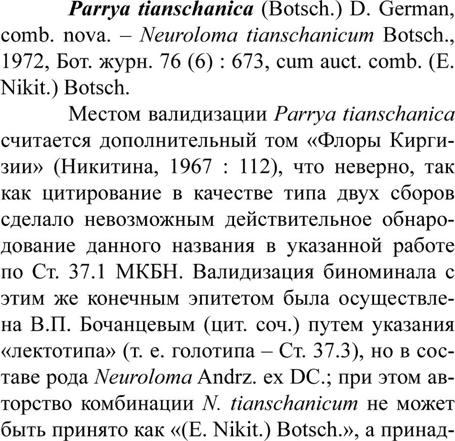 NOTES. By citing two collections as ‘type’, Nikitina (1967) invalidly published the name Parrya tianschanica under Art. 40.1 (McNeill et al. 2012). A combination with the same epithet was validated later by Botschantzev (1972: 673) by citing the single collection as ‘lectotype’ (i.e., holotype; Art. 40.3) in the genus Neuroloma, which was used as the basionym for validating the name P. tianschanica (German 2012b). |