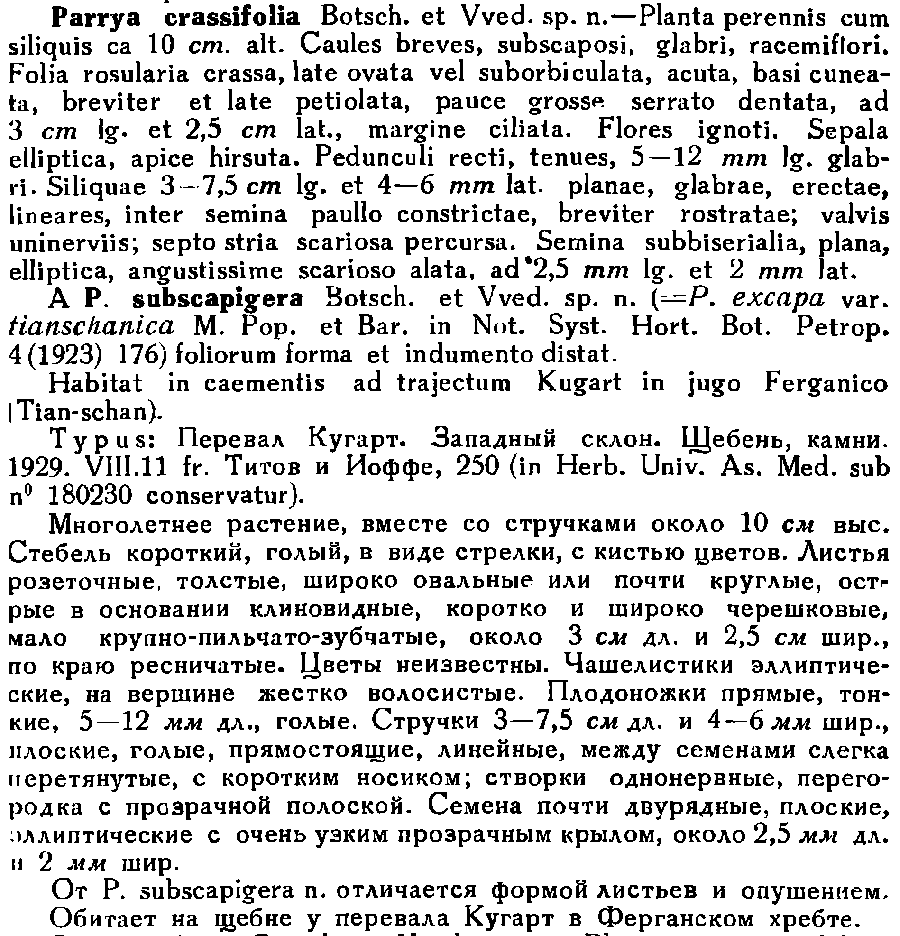 | Andriy Kovalchuk | Протолог Parrya crassifolia Botsch. & Vved. (Ботанические материалы гербария Института ботаники и зоологии Академии наук УзССР 12: 9. 1948):