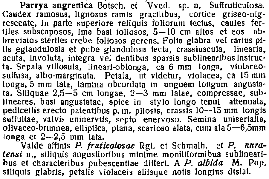 | Andriy Kovalchuk | Протолог Parrya angrenica Botsch. & Vved. (Ботанические материалы гербария Ботанического института Узбекистанского филиала Академии наук СССР 3: 14(-15). 1941):