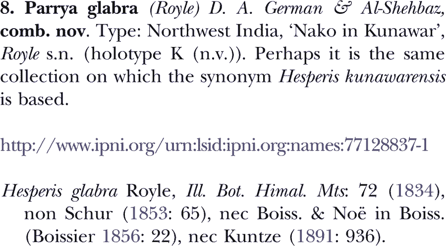 | Andriy Kovalchuk | Обнародование комбинации Parrya glabra (Royle) D.A. German & Al-Shehbaz (Kew Bulletin 68(3): 462. 2013 [22 Jun 2013]):