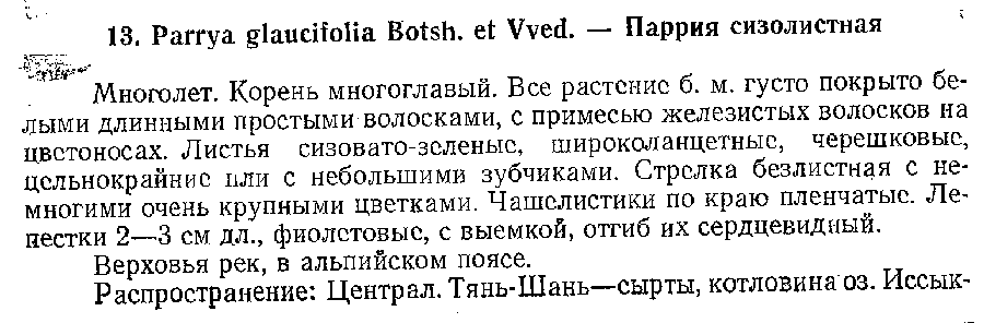 | Andriy Kovalchuk | Описание Parrya glaucifolia Botsch. & Vved. ex Nikitina (Флора Киргизской ССР 6: 210(-213). 1955), nom. inval., опубликованное без латинского диагноза:
