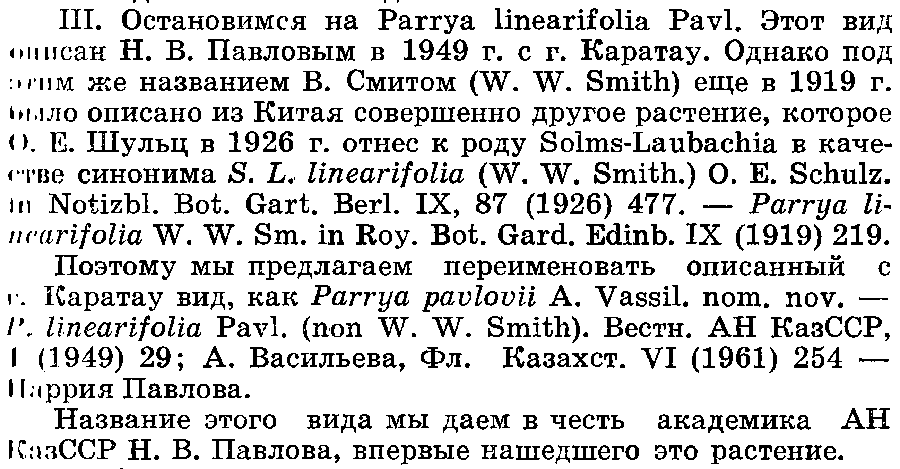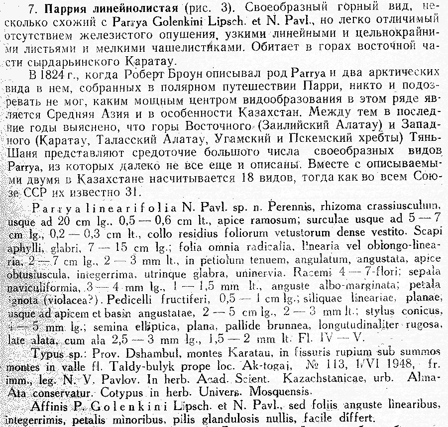 Протолог Parrya linearifolia Pavlov, nom. illeg. (Вестник Академии наук Казахской ССР 46: 29. 1949):