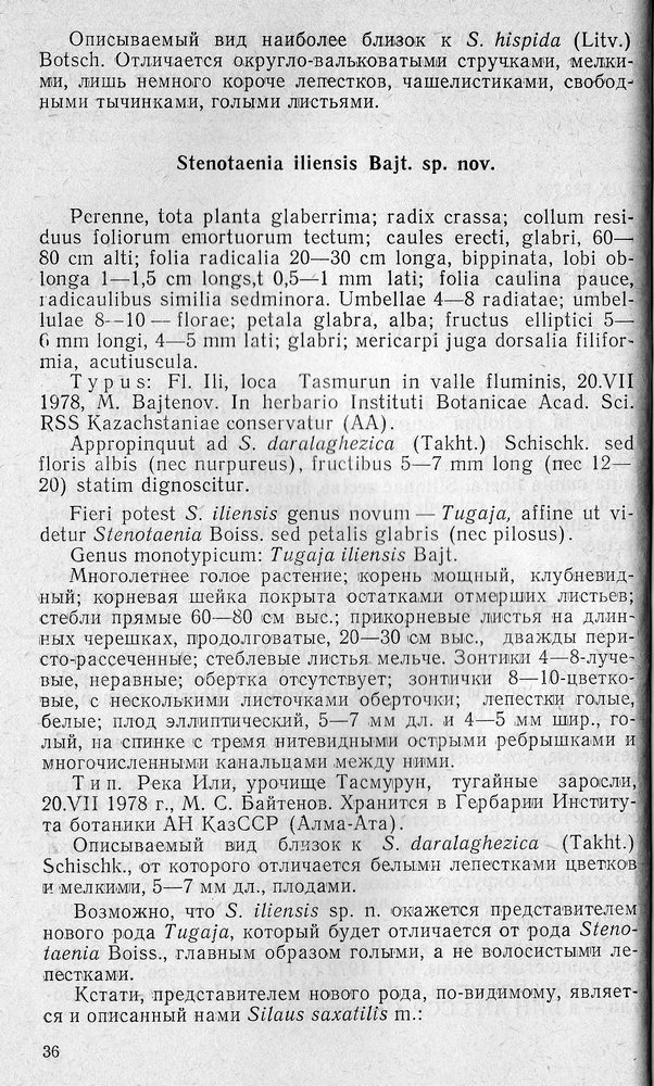 | Vladimir Epiktetov | А.А.Иващенко нашла статью Байтенова М.С в "Ботанические материалы гербария" В13 (1983) ин-та Ботаники АН КазССР где описывается Stenotaenia iliensis Bajt. и упоминается, что "возможно этот вид окажется представителем нового рода Tugaja, отличие которого от Stenotaenia главным образом голыми, а не волосистыми лепестками" У меня скан этой статьи плохого качества. Если описание будет нужно позже наберу. |