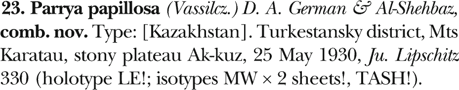 | Andriy Kovalchuk | Обнародование комбинации Parrya papillosa (Vassilcz.) D.A. German & Al-Shehbaz (Kew Bulletin 68(3): 465. 2013 [22 Jun 2013]):