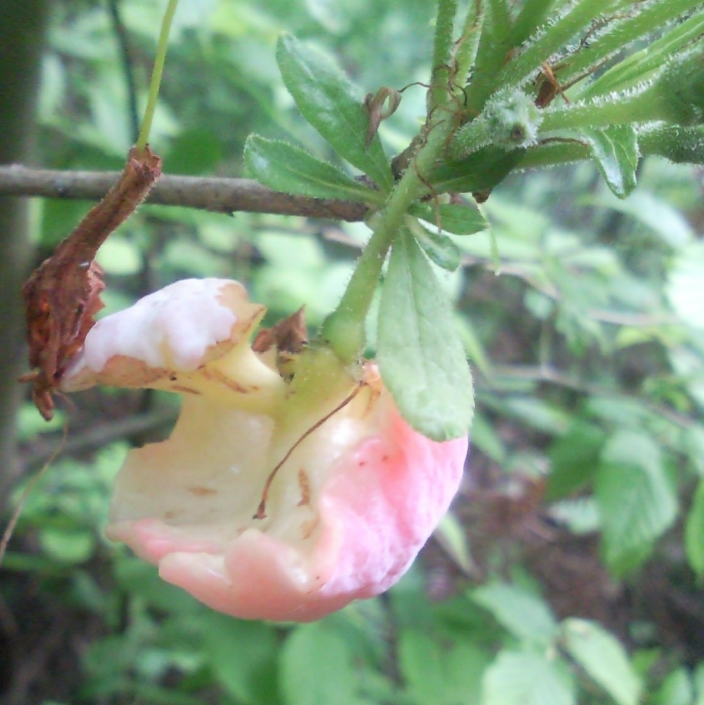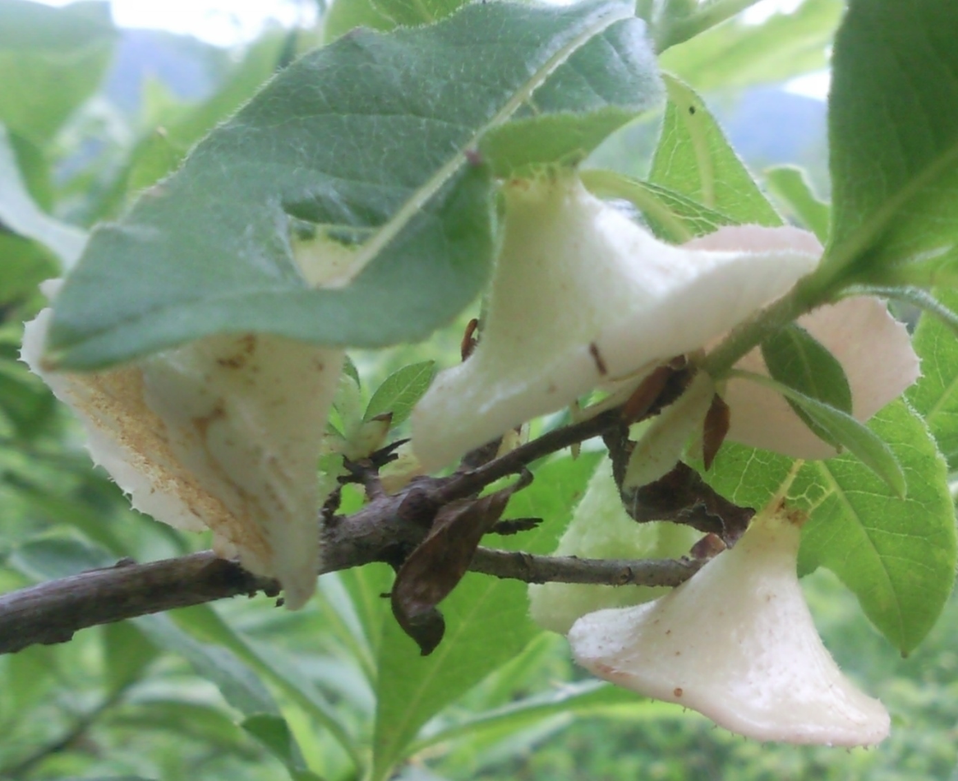 | Dmitry Oreshkin | Растение, вероятно, жимолость, а наросты - грибы. Чтобы понять, к какой группе относятся, надо разглядеть внешнюю и внутреннюю поверхности "воронок". |