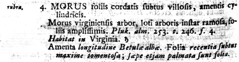 Лектотип Morus rubra L. - Herb. Linn. 1112.6, собр. P. Kalm, Habitat in Virginia. Выбран J. L. Reveal in Jarvis (ed.), Order out of Chaos : 683 (2007).