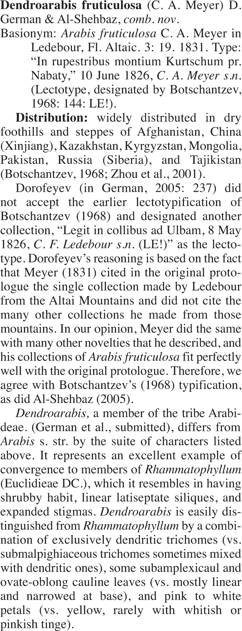 | Andriy Kovalchuk | Обнародование комбинации Dendroarabis fruticulosa (C.A. Mey.) D.A. German et Al-Shehbaz (Harvard Papers in Botany 13(2): 290. 2008):