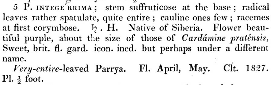 | Andriy Kovalchuk | Протолог Hesperis speciosa Sweet (сопровождающая первоописание иллюстрация является лектотипом Parrya integerrima G. Don и Hesperis speciosa Sweet (см. D. A. German (2014) Phytotaxa 173(1): 34  (The British flower garden Ser. II, 2: t. 135. 1833):