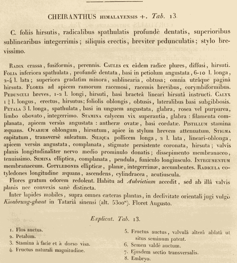 Протолог Cheiranthus himalayensis Cambess. и сопровождающая его иллюстрация (Voyage dans l'Inde pendant les annees 1828 a 1832 4(Bot.): 14, t. 13. [Apr 1835 - Dec 1844]):