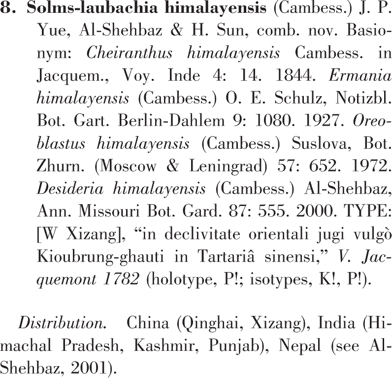 | Andriy Kovalchuk | Обнародование комбинации Solms-laubachia himalayensis (Cambess.) J.P. Yue, Al-Shehbaz & H. Sun (Annals of the Missouri Botanical Garden 95(3): 534. 2008 [23 Sep 2008]):