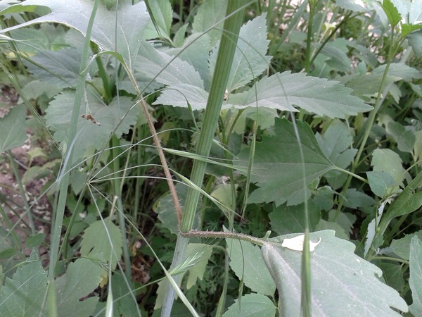 На фото группа сеянцев разного размера (крупный – 45 см в высоту, и более мелкие), возле ж.д. насыпи в пригороде, на краю акациевой (робиниевой) рощи. Ростов-на-Дону, 01.06.2017. Второе фото - стебель с черешками.