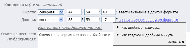 | Dmitry Oreshkin | Максим, координаты точки можно вводить в 3-х(!) разных форматах, о чём написано в форме: