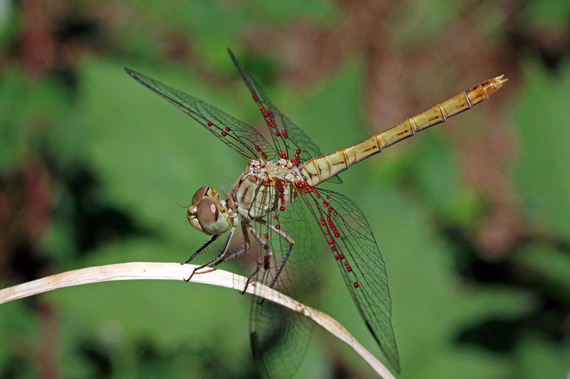 Только просматривая сделанный снимок стрекозы (по-видимому, обыкновенной) на мониторе, увидел у неё, в основном, на крыльях, какие-то красные бусинки. Поискал в интернете и нашёл: