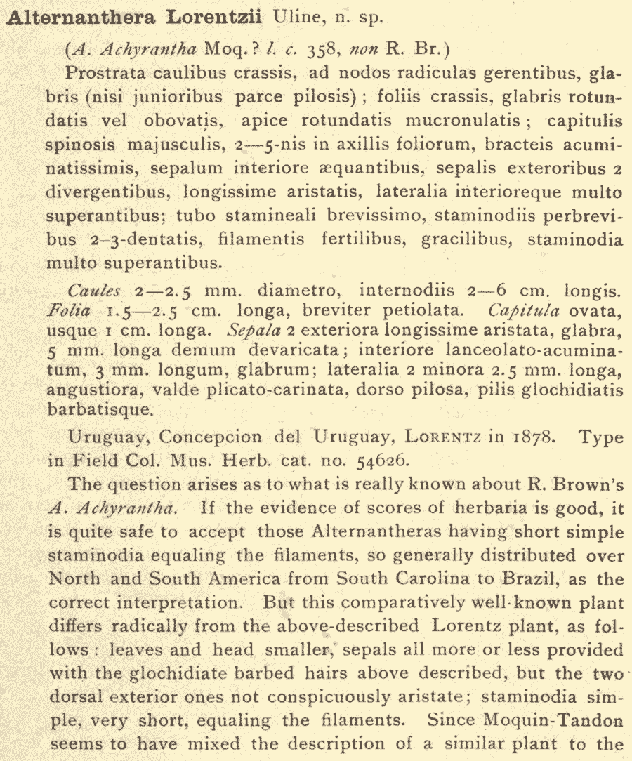 Протолог Alternanthera lorentzii Uline (Publications of the Field Columbian Museum. Botanical series 1: 421. 1899):
