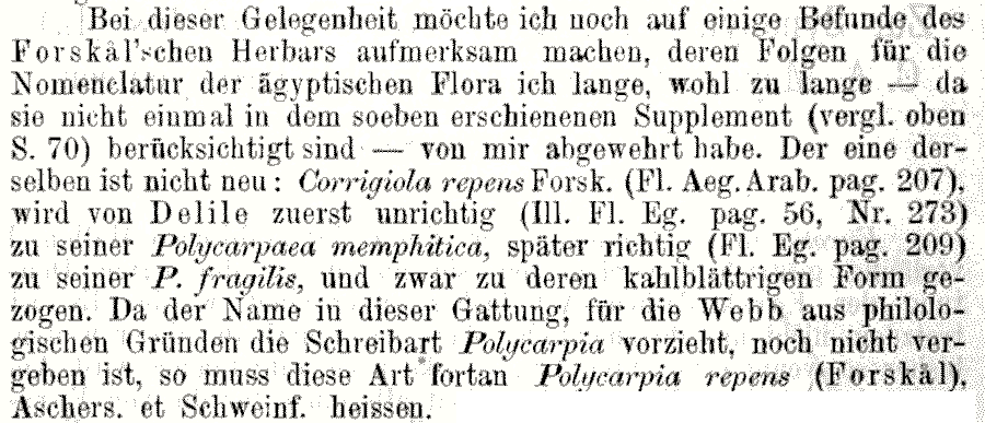 | Andriy Kovalchuk | Обнародование комбинации Polycarpaea repens (Forssk.) Asch. & Schweinf. (Oesterreichische Botanische Zeitschrift 39: 126. 1889):