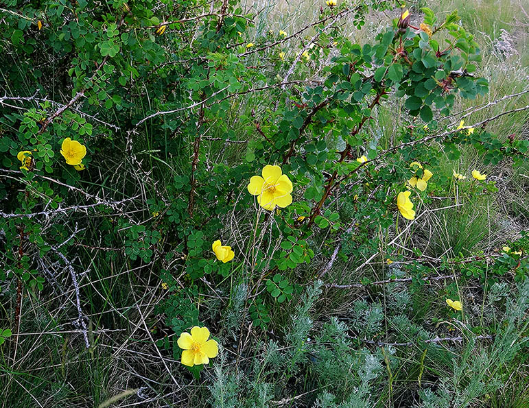 В самом начале дорога на Алтын-Эмель живописна не только горами, но и цветущими растениями. Цветы на этом кусте были похожи на цветы шиповника. Но они были необычного желтого цвета.