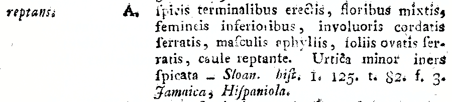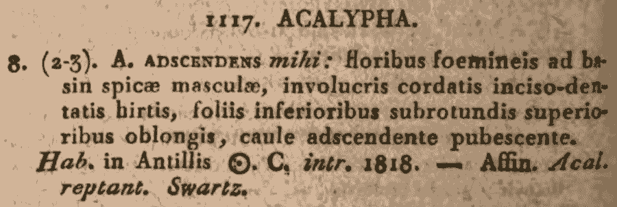 Протолог Acalypha reptans Sw. (Nova Genera & Species Plantarum seu Prodromus descriptionum Vegetabilium, maximam partem incognitorum quae sub itinere in Indiam Occidentalem annis 1783-87: 99. 1788 [20 Jun-29 Jul 1788]):