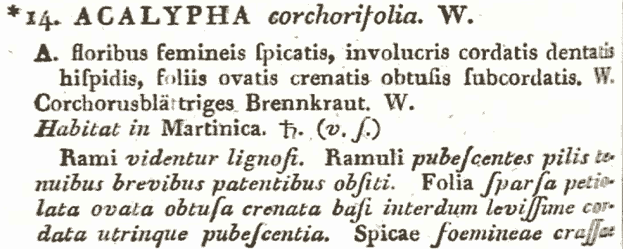 Протолог Acalypha corchorifolia Willd. (Species Plantarum, ed. 4, 4(1): 524(-525). 1805):