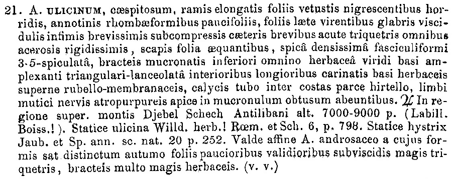 Протолог Statice ulicina Schult. (Systema vegetabilium: secundum classes, ordines, genera, species. Cum characteribus differentiis et synonymis, ed. 15 bis [Roemer & Schultes] 6: 798. 1820 [Aug-Dec 1820]):
