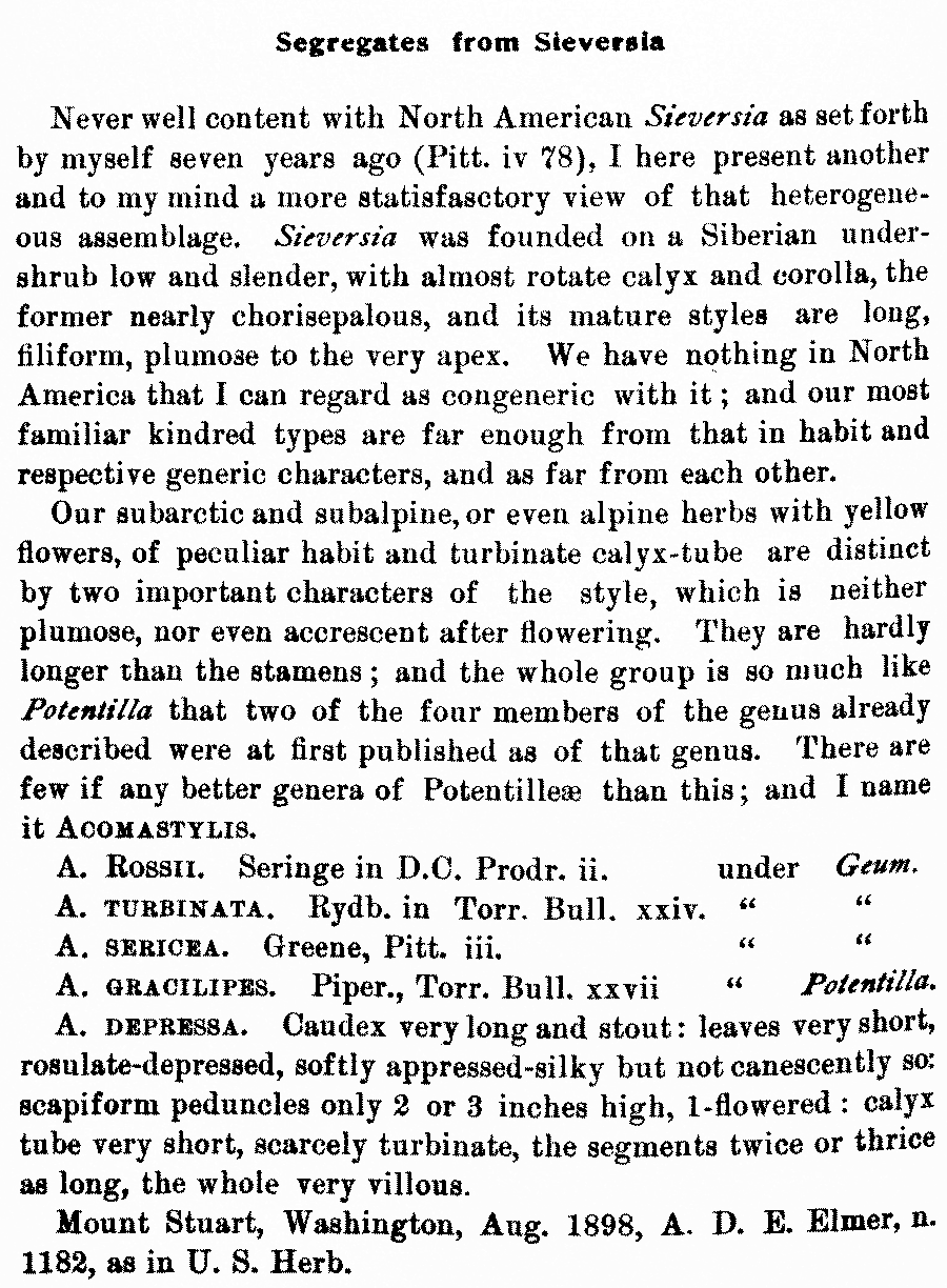 | Andriy Kovalchuk | Протолог рода Acomastylis Greene (Leaflets of Botanical Observation and Criticism 1: 174. 1906 [23 Jan 1906]; lectotype: Acomastylis rossii (R.Br.) Greene ( Sieversia rossii R.Br.), chosen by: Rydb. N. Amer. Fl. 22(5): 412. 1913 [23 Dec 1913]):