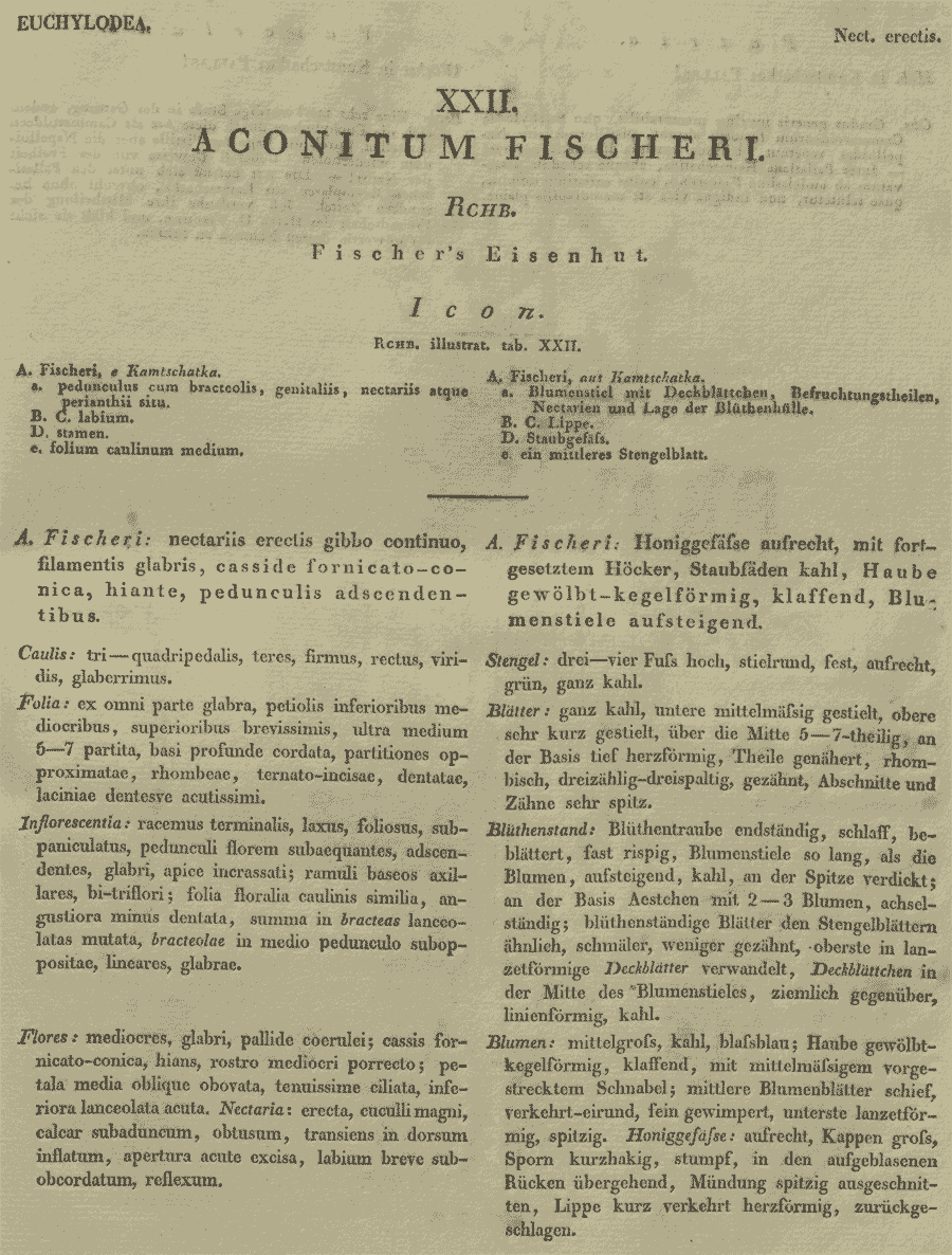Протолог и иллюстрация (иконотип) Aconitum fischeri Rchb. (Illustratio Specierum Aconiti Generis: t. XXII. 1823):